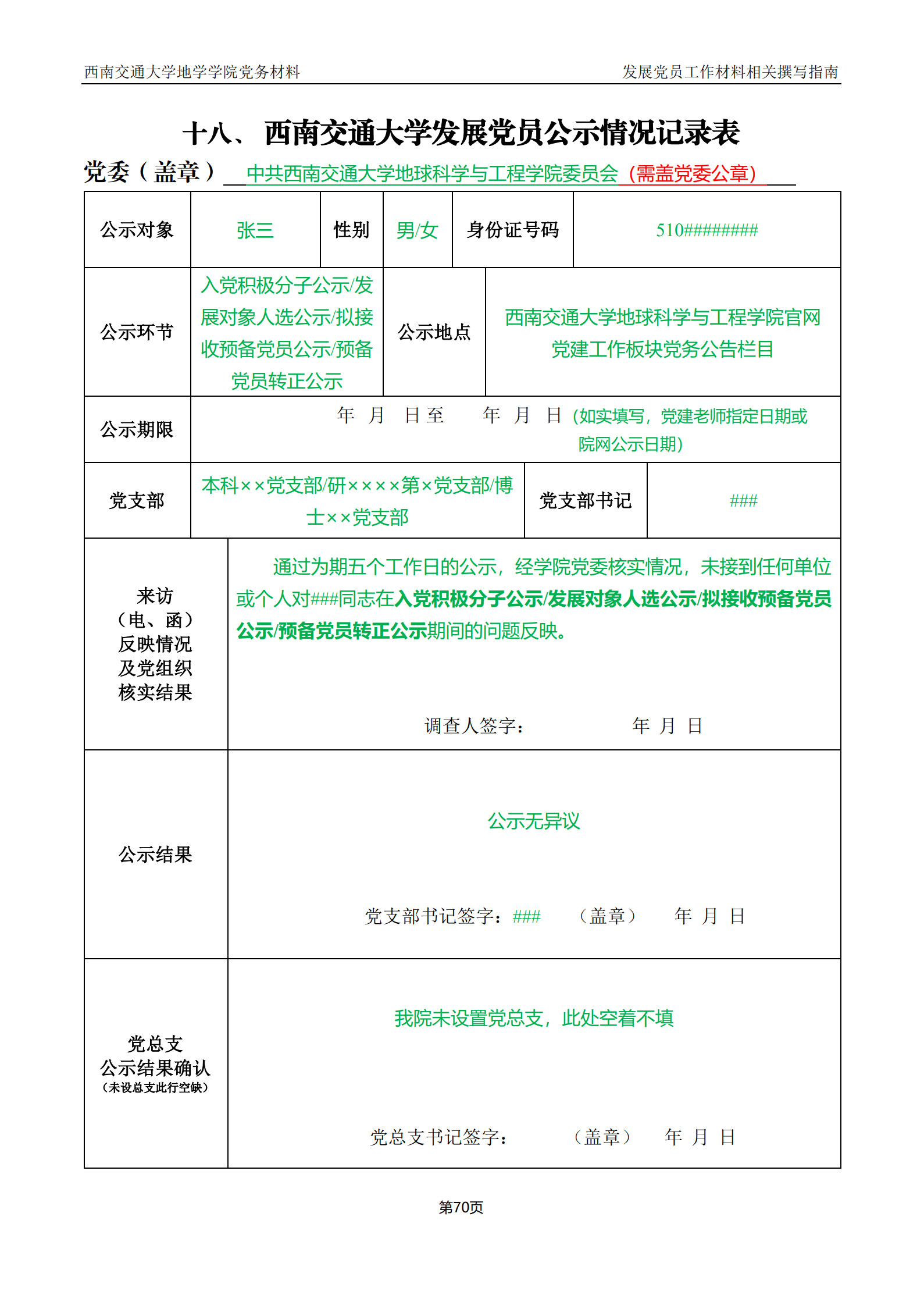 西南交通大学发展党员公示情况记录表撰写指南: