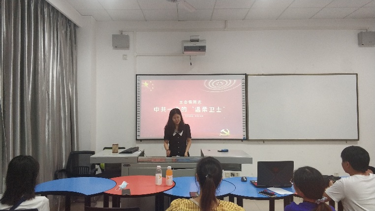 赵静同志向大家介绍了“温柔卫士”王会悟同志为中共一大召开所做的不可磨灭的贡献。她讲到,1921年,出席中国共产党第一次全国代表大会15位代表之外,有一位女性,她虽然不是正式代表、没有参加党的会议,但却活跃在党的一大台前幕后,并发挥了重要作用。多年以后,加在她身上的荣誉有很多:南湖会议的“红娘”、“一大”幕后英雄、中共历史上第一个“会务工作者”,她就是一大代表李达的夫人王会悟。毛主席由衷地称赞他们夫妻俩:“你们是真正的人”。王会悟不计名利,甘守奉献,无私为党,不愧是“开天辟地一女杰”。