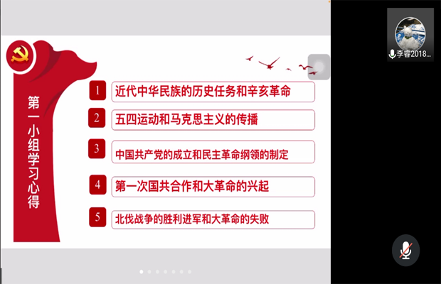 会议伊始,党史领学小组第一组组员李睿同志带大家回顾了近代以来中国共产党发展史的重要历史节点。李睿同志介绍道:“中国共产党的诞生,开辟了中国历史的新纪元,从此,中国革命的面貌为之焕然一新。接着,张泽宇同志分享其在阅读抗日战争部分时的感悟,“我党以强大的韧性,以坚定的信仰与信念,以高尚的爱国情操,以伟大的牺牲精神,为抗日爱国统一战线的形成奠定了坚实的基础。”