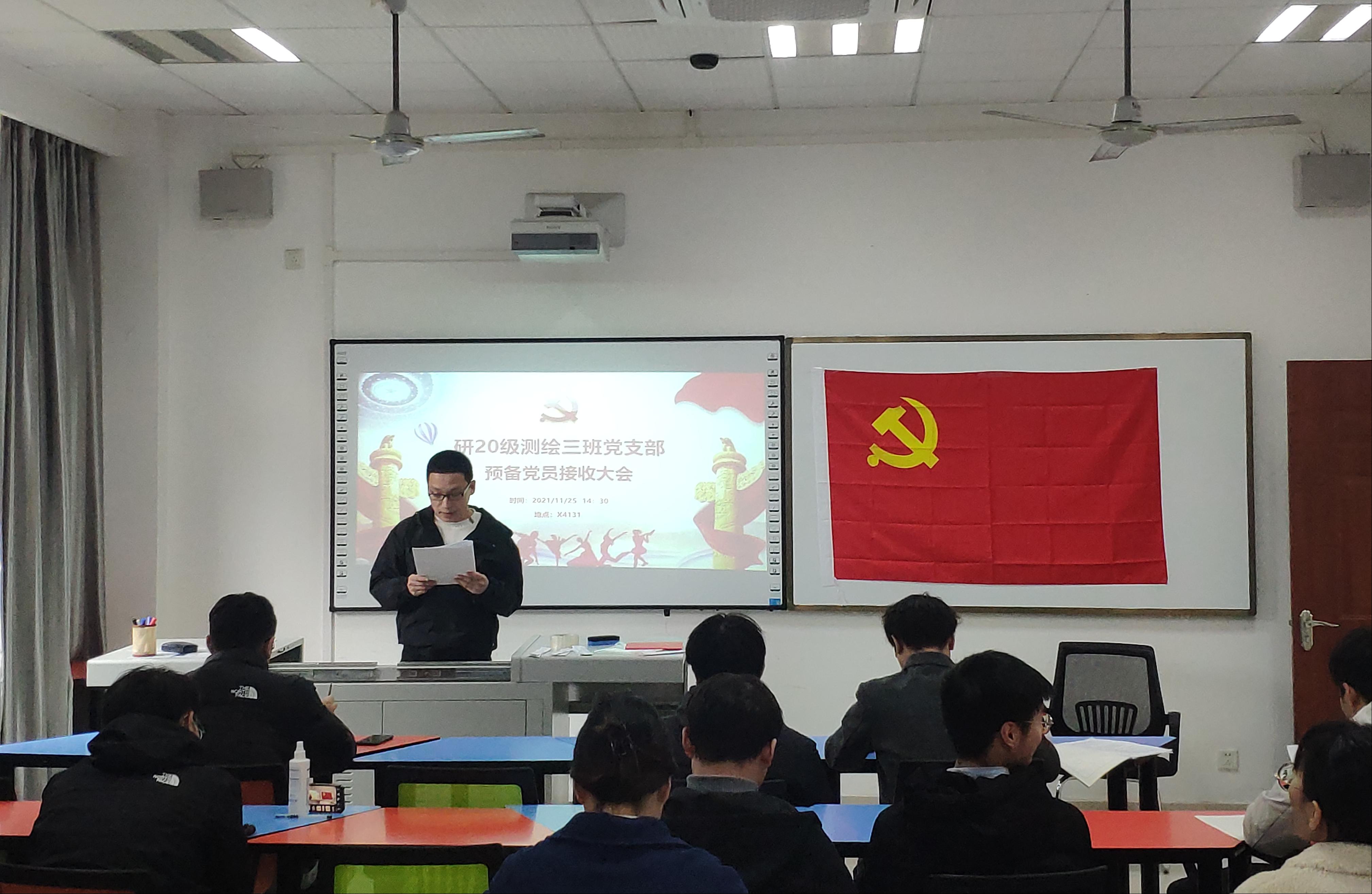 2021年11月25日晚19:30,研20级测绘三班党支部在X4131召开党员大会,会议议题为讨论关于接收王越、王致洪、姚智博等三名同志为中共预备党员的问题。大会由支部书记高颖同志主持,大会应到有表决权的正式党员6名,实到6名,全体入党积极分子列席会议旁听学习。