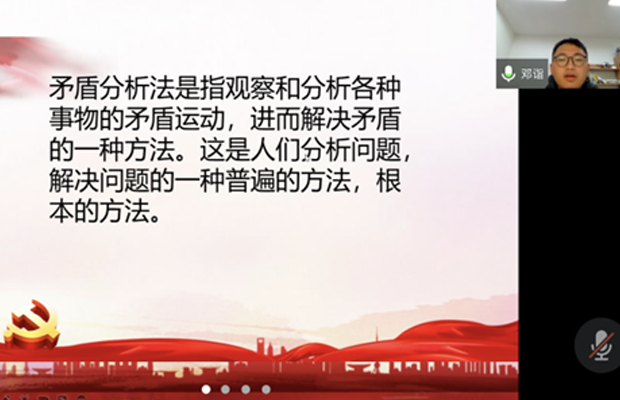 紧接着,第三小组围绕题为《事物的矛盾运动以及矛盾分析方法》进行了分享,从对矛盾的简单认识到介绍事物的矛盾运动再到事物的矛盾分析三个层次做了汇报交流,邓诣同志向大家讲解了矛盾的分析法和矛盾的基本属性及其之间的关系和各自的作用,结合实例讲解了矛盾运动的基本原理和具体事物的矛盾分析。