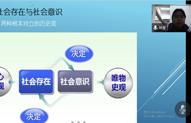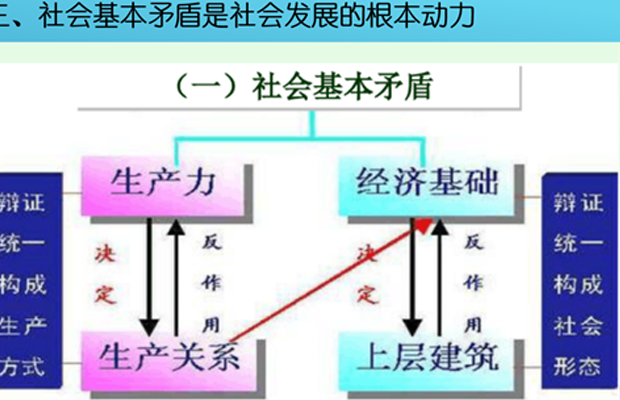 第四小组围绕《社会发展是社会基本矛盾运动的过程》给大家做了汇报分享,杨莹同志通过引出社会存在和社会意识两个概念及其内涵关系,为大家讲述了什么是社会存在与社会意识以及与生产关系之间的联系,从生产力与生产关系、经济基础与上层建筑之间的辩证统一关系得出社会基本矛盾是社会发展的根本动力。