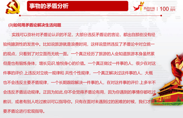 最后,杨鑫同志还就“有妍必有丑为之对,我不夸妍,谁能丑我?有洁必有污为之仇,我不好洁,谁能污我”这一话题展开了讲解,说明事物都是相比较而存在的,体现矛盾双方相互依赖、相互依存,一方的存在以另一方为前提。同时还以“塞翁失马,焉知非福”这一故事说明矛盾的同一性在事物发展过程中的作用。