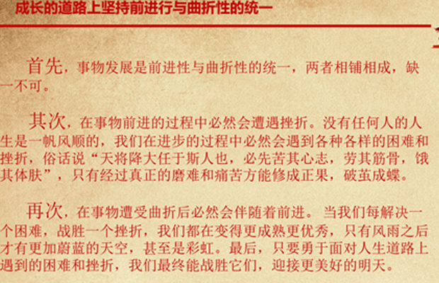 第二小组以《事物的发展是前进性和曲折性的统一》为主题展开讲解,首先讲解人张恒同学抛出“什么是前进性和曲折性的统一”的问题,并通过几个例子告诉我们事物发展的方向是前进的,上升的,但前进的道路是曲折的、迂回的。最后告诉大家,作为一名研究生,我们应该结合这一原理来正确地对待自己成长路上的前进性和曲折性。我们要勇于面对成长和科研的道路上遇到的困难和挫折,最终必定能战胜它们,迎接美好的未来。