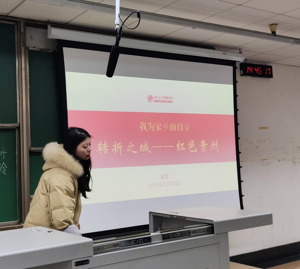 2021年12月15日,研21级测绘第一、第二党支部在J4517开展了主题党日活动——“我为家乡而自豪”。本次活动主要是党员同志通过用家乡的老照片、电影(配音经典片段)、歌曲(演唱红歌)、讲红色革命故事等形式分享家乡的故事。