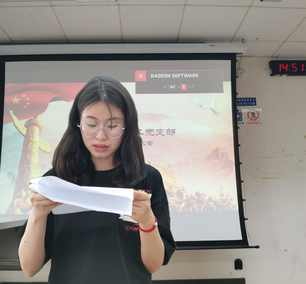 会议第一项就范雨婷同志的转正问题进行了讨论,首先由范雨婷同志宣读转正申请书,汇报在预备党员这一年期间的表现情况。范雨婷同志在预备期这一年中积极向组织靠拢,乐于帮助身边同学,时常与优秀的党员同志交流,提高自身的思想政治站位,学习上勤勤恳恳,取得了良好的学习成绩。在宣读结束后,由范雨婷的第一二入党介绍人介绍了范雨婷同志在预备期一年的表现情况,接着由支委会组织委员江文星同志对范雨婷同志的综合考察情况和表现情况进行了汇报,汇报结束后。支部正式党员对范雨婷同志能否如期转正进行了投票表决,最后由蒲思邈同志宣读表决情况,经过支部全体正式党员无记名投票,一致通过范雨婷同志如期转为中共正式党员的申请。
