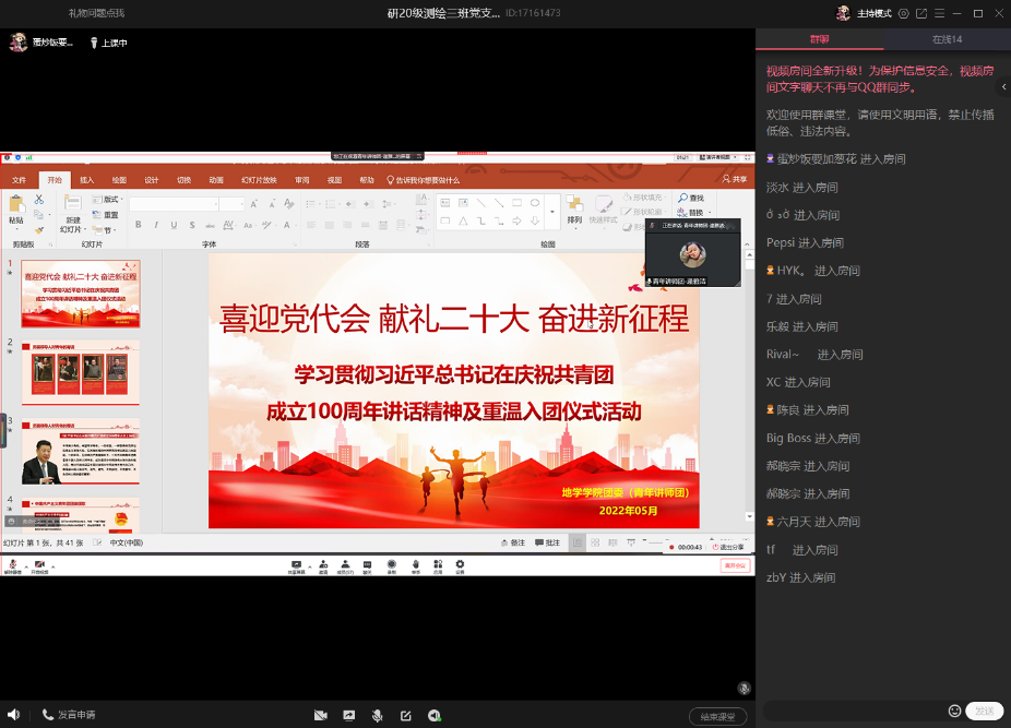 党委的指示下,2022年5月24日晚八点,研20级测绘三班党支部于线上开展了相关学习活动。本次学习活动由支部逄雅洁同志领学。