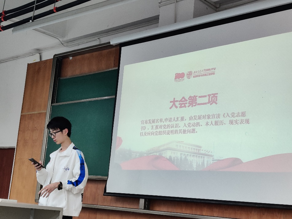 本科测绘党支部于犀浦校区X4154教室召开预备党员接收大会,讨论关于任纪洲和应涛泽两名发展对象接收问题。本次会议由党支部书记王文涛主持,本科测绘党支部全体党员、预备党员参与此次会议。