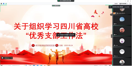 2022年9月24日12:45,研20级测绘第四党支部开展四川省高校“优秀支部工作法”活动。党的十八大以来,四川省高校党支部立足职能职责,坚持“为党育人、为国育才”初心使命,在深化教学科研攻关、服务师生群众、提高人才培养质量等方面有效发挥战斗堡垒作用,但同时也存在有的高校党支部政治引领和政治吸纳能力不强、组织生活制度落实不严格、党员发展和教育管理机制不健全、党务工作不规范等问题针对这些问题,技照“可学习、可借鉴、可复制、可推广”的原则,择优确定了20个“优秀支部工作法”。