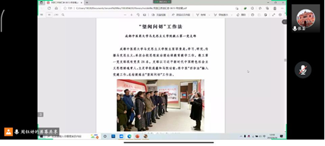 党支书周钰婷向我们讲述了“优秀支部工作法”,党支部是党的基础组织,是党组织开展工作的基本单元,是党在社会基层组织中的战斗堡垒,是党的全部工作和战斗力的基础。习近平总书记高度重视高校党的支部建设工作,深刻指出:“党支部是分布在教研室、实验室、教学科研团队、学生班级中的‘火车头’,也是党联系和团结师生、做思想政治工作的组织依托要抓在经常、严在平时。”为我们做好高校支部建设工作指明了方向,提供了遵循。