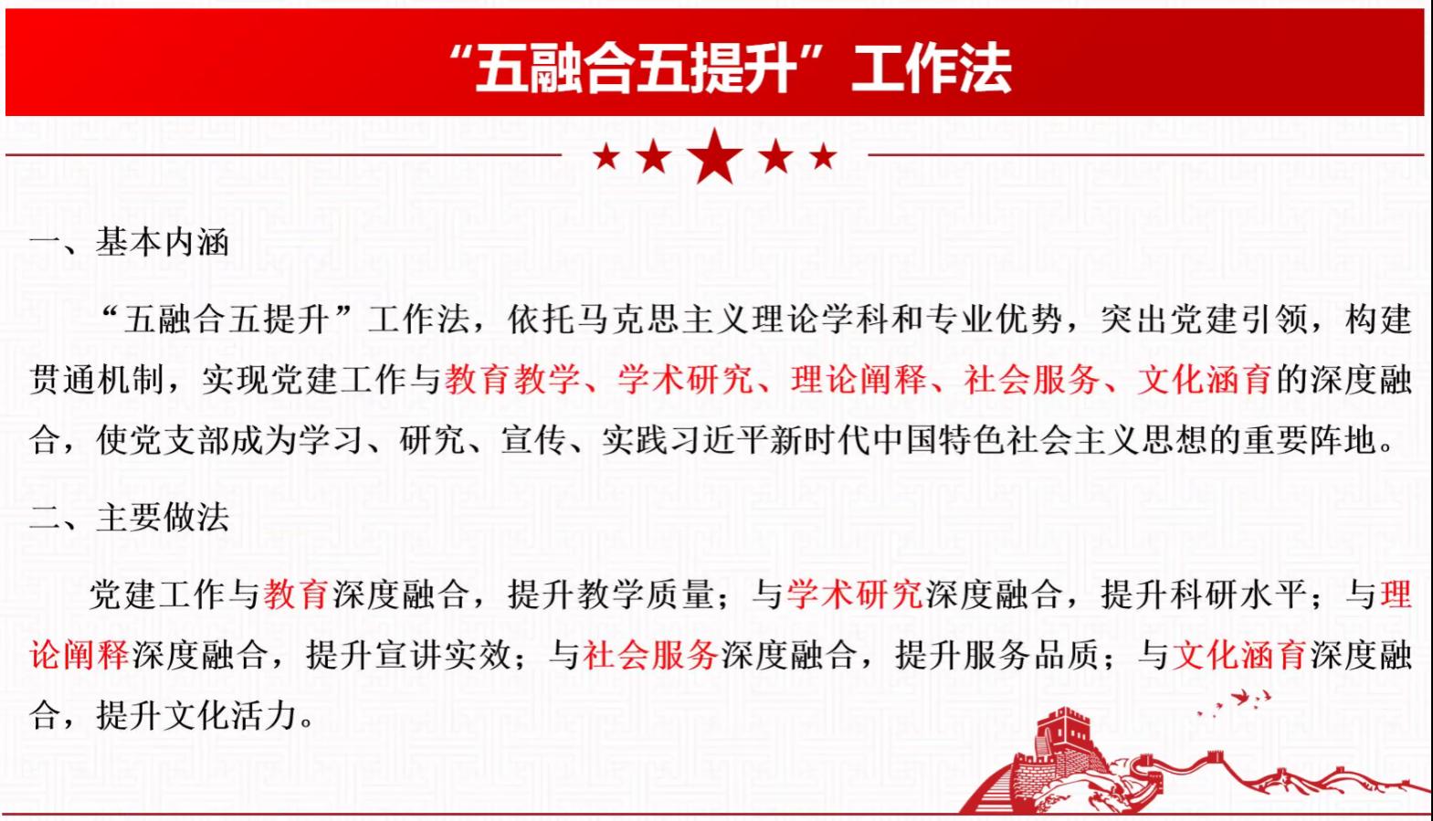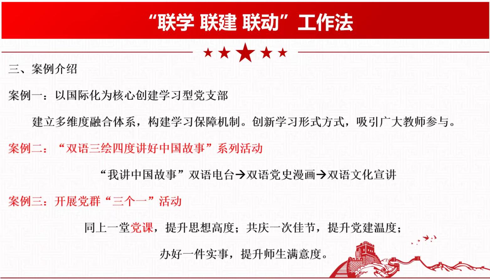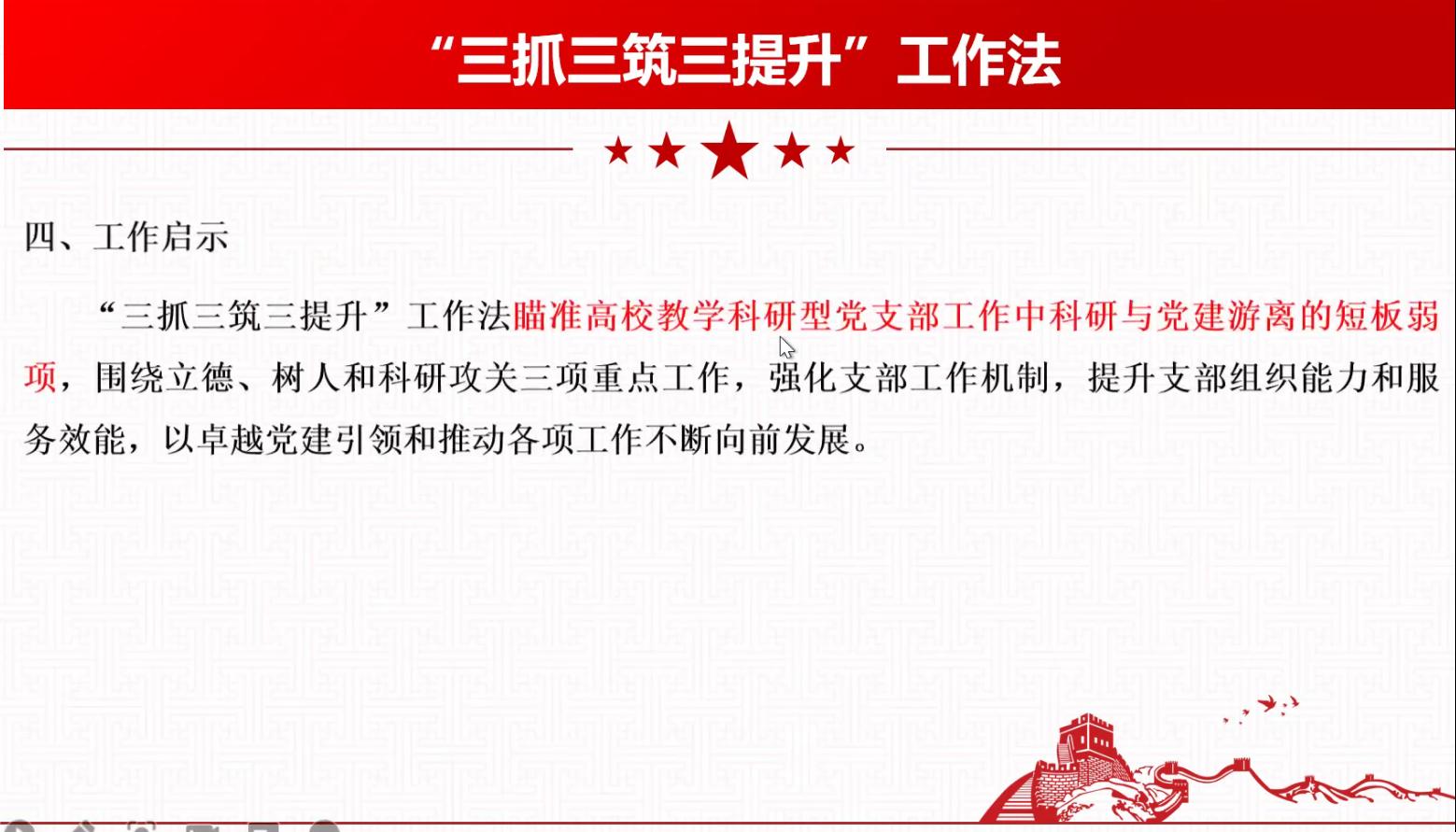 其次,任颖同志重点为大家介绍了《四川省高校“优秀支部工作法”》中的“五融合五提升”工作法、“联学 联建 联动”工作法、“三抓三筑三提升”工作法、“育人四部曲”工作法。每一项工作法都有他们各自的特色和优点,针对不同的问题应用不同的方案,同时主持人还介绍了一些案例让大家深入学习这些工作方法。这些优秀的工作方法为大家带来了很多启示。