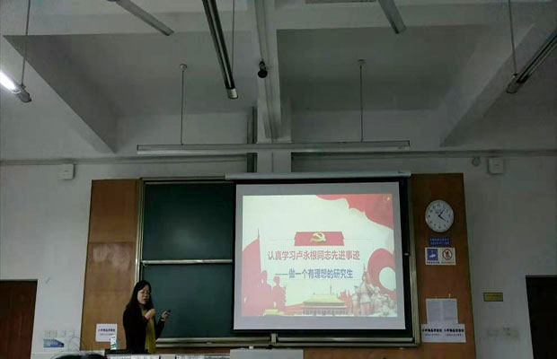 院士,我国著名作物遗传学家,也是一名有着近70年党龄的老党员,一生节俭朴素,被誉为“布衣院士”。他始终发扬共产党员艰苦朴素、无私奉献的优良作风,家中使用上世纪八十年代的旧沙发、旧电视、旧铁架床,却将毕生积蓄8809446.44元全部捐赠给华南农业大学,设立教育基金。不仅如此,还将遗体无偿捐献给医学事业。龚正君教授也讲述了自己近20年的教育与科研经历,一个伟大的教育工作者始终是一名爱国者。而衡量一位教师是否具有爱国主义的思想政治素质,关键要有对教育事业的责任感和使命感。学习卢永根精神,首先要学习他的爱国主义精神。接着,龚正君教授还谈到卢永根同志所具备的坚持原则、严于律己、淡泊名利等优秀品质,展示了优秀共产党员应具有的时代风采。最后,龚正君教授讲到作为环境专业的研究生,更应在十九大精神的灌溉下,抓住机遇,为绿水青山寻找自己的那座金山银山。