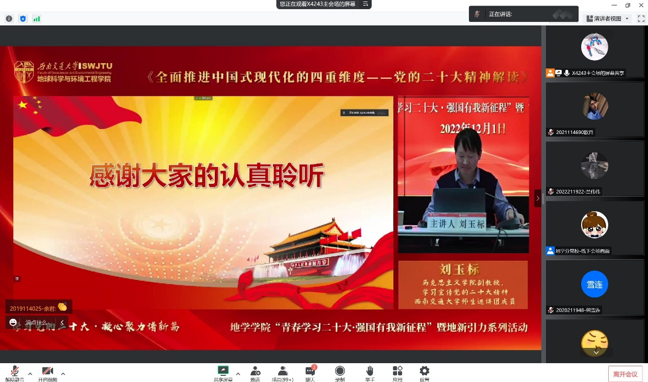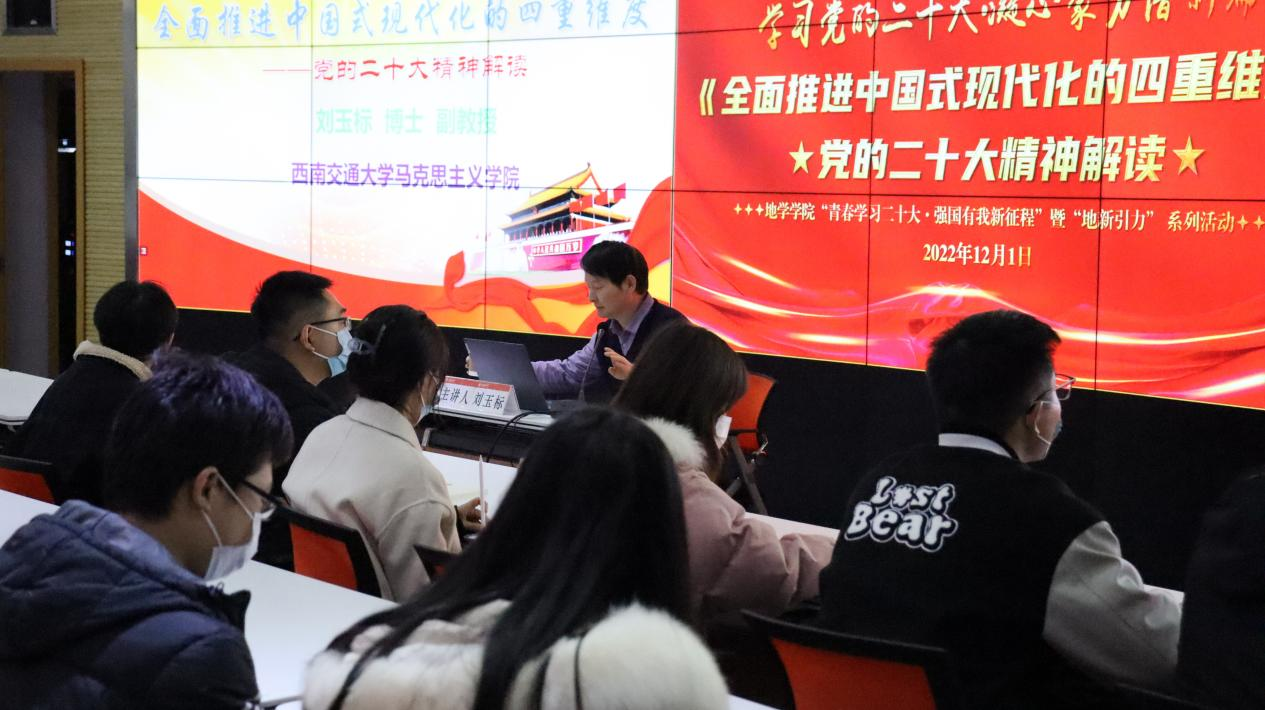 为深入学习贯彻党的二十大精神,号召全体党员用党的二十大精神武装头脑。121日下午16:00点整,拉斯维加斯娱乐城 在X4243会议室以线下、线上,集中和个人自行收看相结合的方式开展“党的二十大精神专题宣讲”活动。本次讲座由西南交通大学马克思主义拉斯维加斯娱乐城 副教授、西南交通大学党的二十大精神师生巡讲团成员刘玉标主讲,拉斯维加斯娱乐城 专职组织员、党务秘书李晓宇主持,院内学生党员、发展对象、入党积极分子、青年讲师团成员代表共计800余人参加。