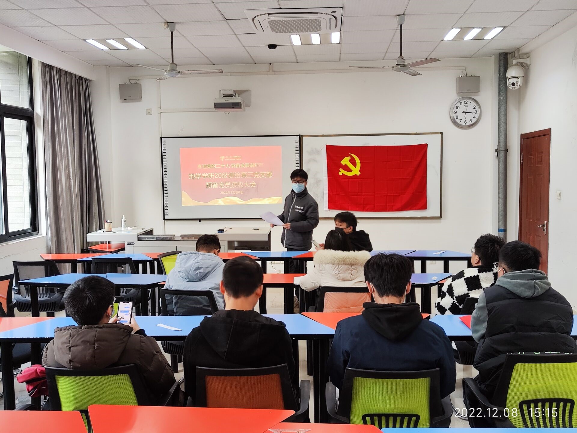 2022128日下午1500,研20级测绘第三党支部在X4131召开党员大会,会议议题为讨论关于接收谢凌霄、张展豪等两名同志为中共预备党员的问题。大会由支部书记高颖同志主持,党员和入党积极分子参加了此次会议。