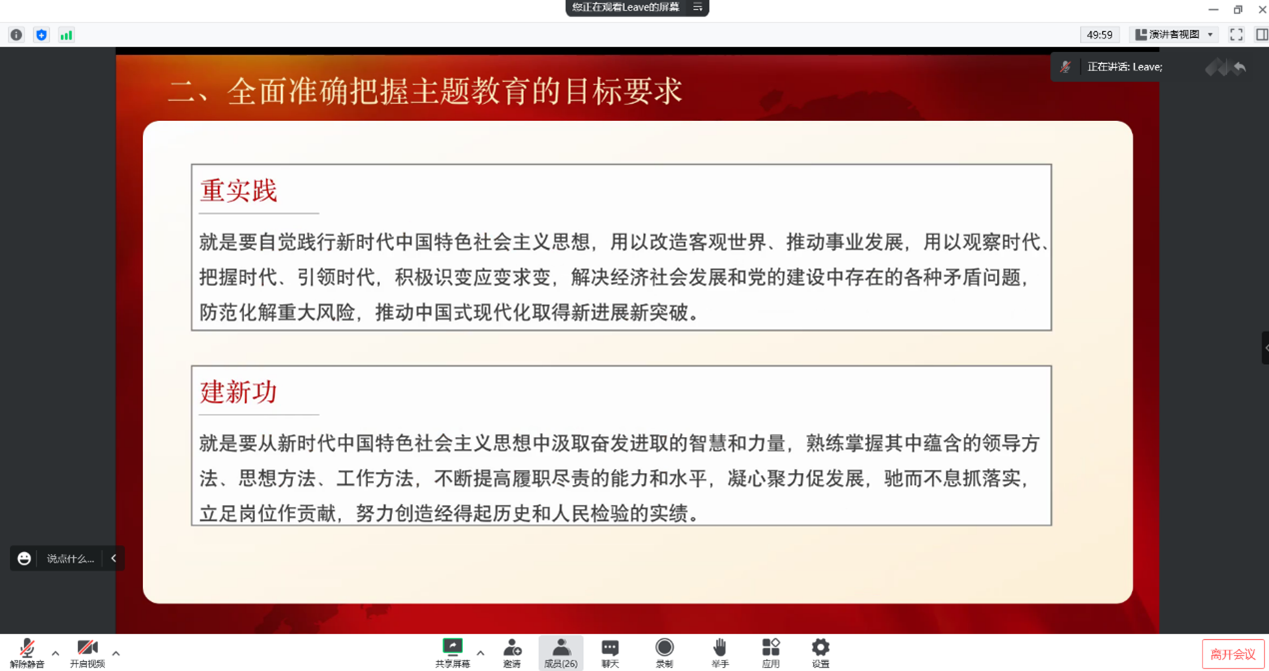 会议开始,刘烨同志带领支部全体党员深刻认识开展这次主题教育的重大意义:是统一全党思想意志行动、始终保持党的强大凝聚力、战斗力的必然要求;是推动全党积极担当作为、不断开创事业发展新局面的必然要求;是深入推进全面从严治党、以党的自我革命引领社会革命的必然要求。