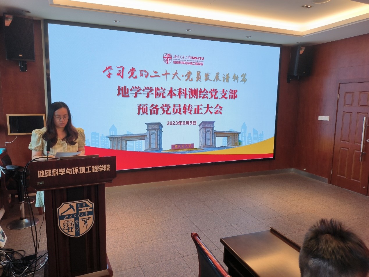 本科测绘党支部于2023年6月9日19:30在X4520召开2022-01期预备党员转正大会暨2023-01期预备党员接收大会:审议、讨论、表决关于任纪州、应涛泽2名同志转为中共正式党员以及郇江龙等7名同志接收为中共预备党员的相关事宜。转正大会由支部指导老师李婧老师主持、接收大会由本科测绘党支部书记任纪州同志主持。党支部全体党员七名发展对象出席本次会议。
