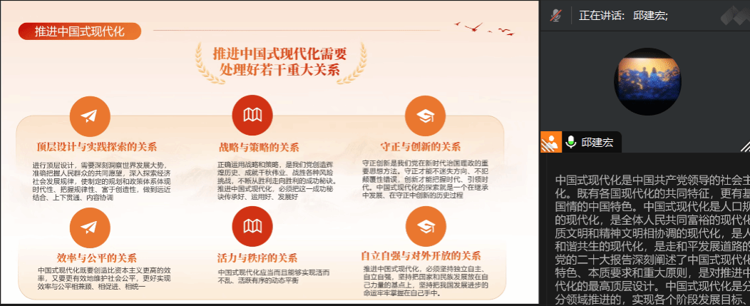 邱建宏同志还就深入学习贯彻习近平总书记有关主题教育最新重要讲话精神阐述了顶层设计与实践探索的关系、战略与策略的关系、守正与创新的关系、效率与公平的关系、活力与秩序的关系以及自立自强与对外开放的关系,并结合当前时政热点巴以冲突阐述了我国自立自强的原则和必要性。