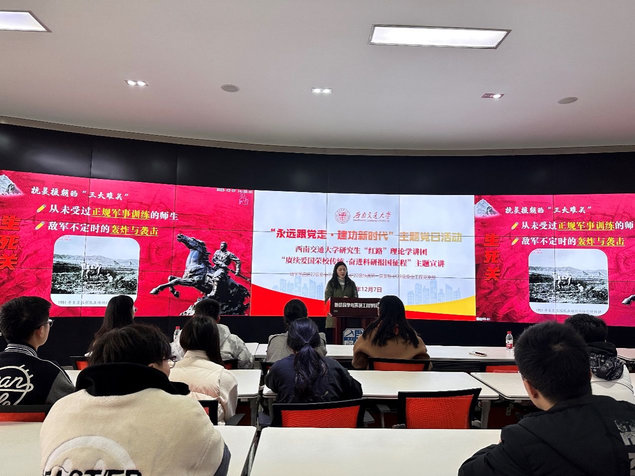 为进一步弘扬爱国主义精神,激励广大研究生党员、预备党员、积极分子投身科研工作,西南交通大学研22、23级安全工程党支部、研22级地质工程党支部于今日成功举办了“永远跟党走,建功新时代”主题党日活动。