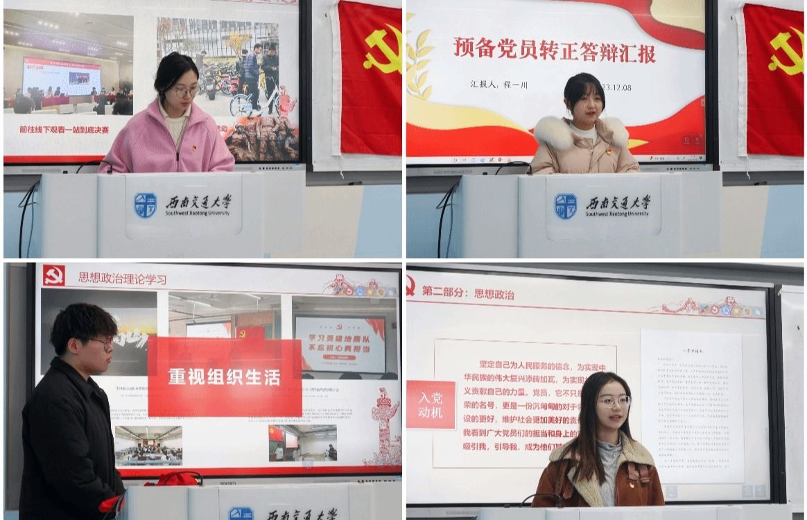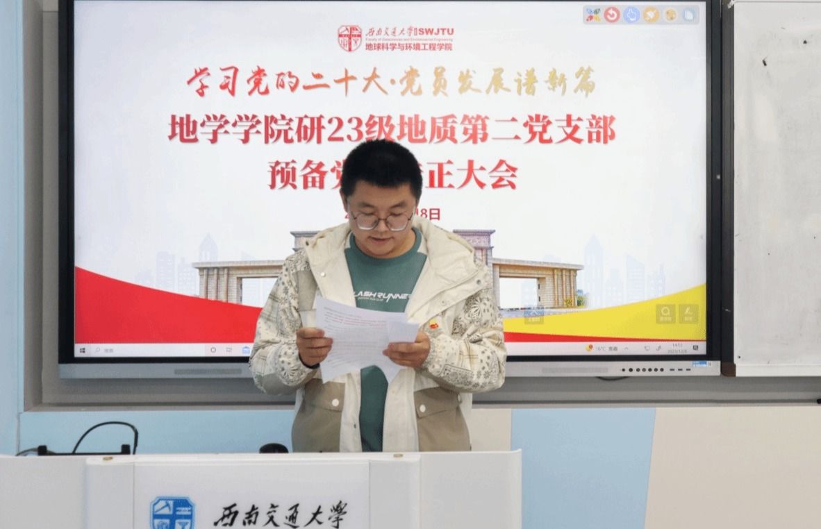 研23级地质第二党支部于J4205召开预备党员转正大会。本次转正大会由本支部书记黄丽敏同志主持。大会议程为:清点与会党员人数、申请转正的预备党员汇报自己在预备期间的综合表现、入党介绍人介绍预备党员的考察情况、支委会向支部汇报预备党员综合考察情况、正式党员采取无记名投票的方式对预备党员逐个表决、宣读支部大会决议以及预备党员转正时的表态等。