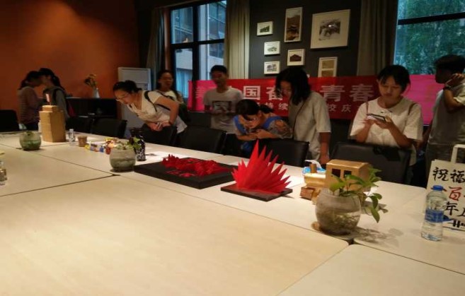 在展厅中央陈列着的就是本次比赛的投稿作品,放眼望去,整个桌面上琳琅满目,让人应接不暇,各式各样的手工艺品展现着参赛选手的匠心独运和奇思妙想:有的小组独具创意,选取树叶作为主材料,将整个中国版图用不同的树叶展现出来,在版图上标明了西南交通大学的校园变迁路线,将本次作品的创意元素巧妙地糅合到了一起;有的小组充分展现了设计专业知识,打造了“红旗飘扬·筑梦未来”的立体设计作品,用做作业剩余的PVC板裁剪喷漆,制成了这个作品,侧面看去,崎岖的起伏寓意中国共产党带领人民一路走来,道阻且长,风雨兼程;俯看下去,就是一面飘扬的红旗,代表着国家、民族、交大迎着红旗飘扬的方向奋勇前行;也有小组利用废旧可乐瓶做成了彩绘机车头,瓶盖上熠熠生辉的党徽象征着党和国家引领着轨道交通建设一路向前;还有小组利用学校南门的造型抽象出一个灯具轮廓,利用废旧材料设计制作了一盏煤油灯……展厅的作品各具特色,无不展现着两院学子灵感碰撞后的奇思妙想和“既能想到也能做到”的心灵手巧。来评比的选手聚精会神地观察着展台上的每一件作品,展厅中也不时传来同学们由衷的赞誉之声。
