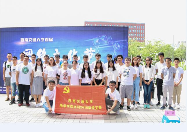 本科2016级党支部全员在标有“西南交通大学首届网络文化节的宣传展板前进行了合影留念,并相互交流了学习心得。