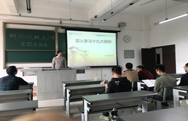 研2016级地质二班党支部在9207室召开学习会,集中学习党的十九大精神。
