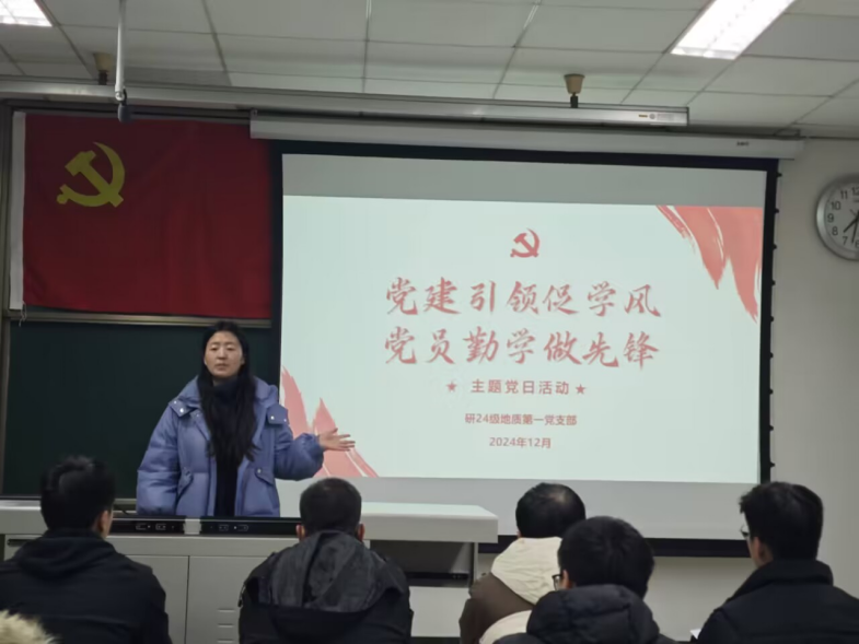 2024年12月19日晚19:30研24级地质第一党支部于九里校区J4220开展了“党建引领促学风,党员勤学做先锋”主题党日活动暨预备党员转正大会。本次活动由党支部书记薛怡然同志主持,支部指导老师杨冰倩老师莅临指导,支部成员包括党员(含预备)、入党积极分子、入党申请人共计13人与会。