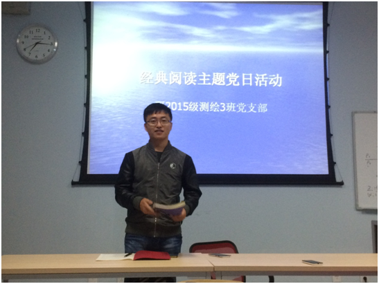 对于每个党员而言,向书本学习必须做到“专心”。党员加强学习,其中读书学习是一条重要的渠道。没有知识,没有文化,怎么提高为人民服务的本领,又怎能发挥党员的先锋模范作用。党员必须加强学习,不学习就会落伍,不学习就会被淘汰。20151120日,2015级测绘三班党支部开展了“经典阅读”主题活动,会议由测绘三班班党支部书记上官磊主持,主要有以下四个部分: