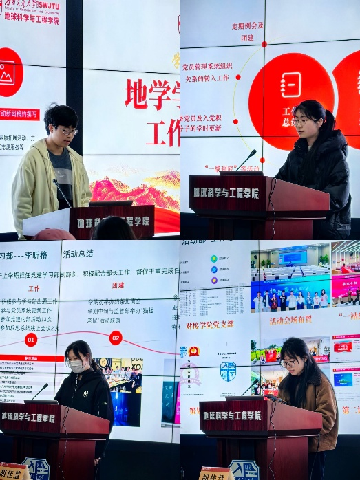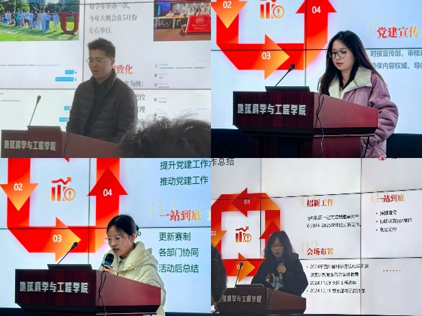 随后,各部门部长及干事依次上台总结上学期工作及本学期规划。宣传部将继续及时全面地对党建各项活动与事务进行宣传报道,规范并创新宣传手法,提升宣传质效;学习部应不断优化各项考试的监考和改卷流程,提高工作效率;监管部计划加强各项活动与事务的监督与管理,提升干事们工作积极性,使工作能认真细致落实;活动部规划在本学期中优化各项活动流程,做好活动策划与准备工作,使活动更加顺利有序。