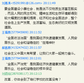 晚上8:00,党员们准时登陆到支部群平台,支部书记刘锟铭介绍了此次活动的目的,以及首次举办网络支部大会的意义。他说,“四个全面”是新一届中央领导集体治国理政的总体框架,是新时期下适合我国国情的伟大决策。