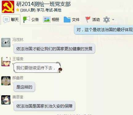 研究生2014级测绘一班党支部首次以互联网为平台,顺利举行支部大会,班级党支部的13名成员参加了该活动,其中正式党员有11名,预备党员2名,入党积极分子1名。此次支部大会的主题是学习“四个全面”,这有助于研究生党员更加清晰的了解与学习党和国家新时期各项工作关键环节、重点领域及主攻方向。