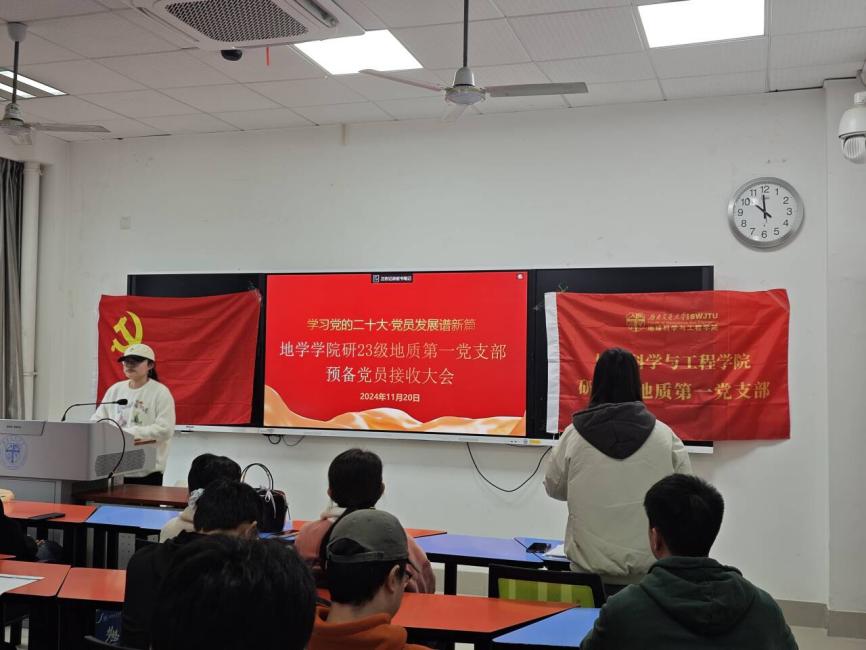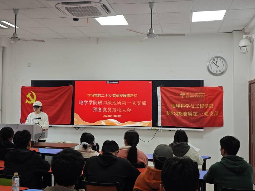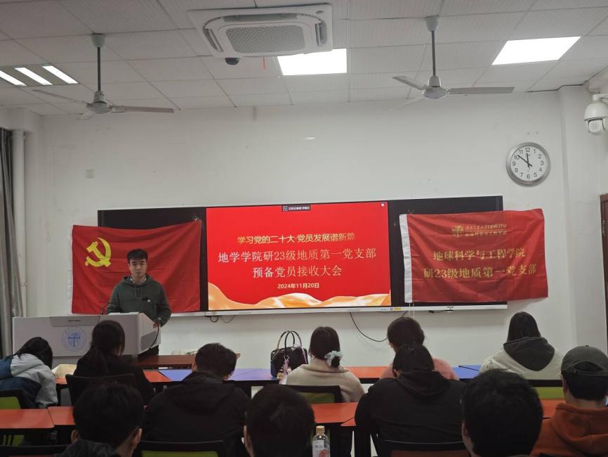 为做好2024年发展党员工作,切实提高党员发展质量。研23级地质第一党支部于2024年11月20日16:00在X4132召开2024-02期预备党员接收大会,本次会议由党支部书王睿同志主持,支部党员、发展对象、入党积极分子和入党申请人总计22人与会。