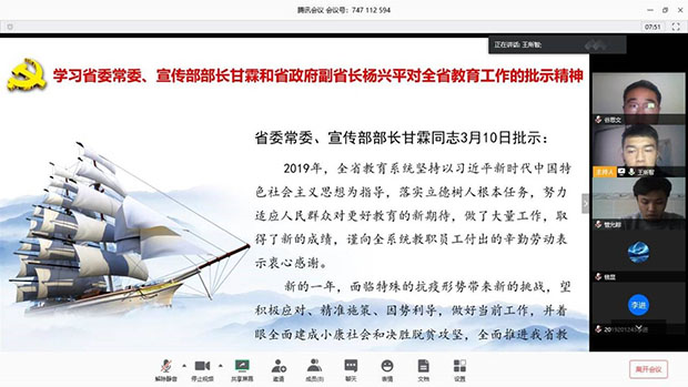 研19级测绘2班党支部召开支部大会,大会宣读了省委常委、宣传部部长甘霖同志和省政府副省长杨兴平同志对全省教育工作的批示精神,学习了省委教育工委书记,教育厅党组书记,厅长李江同志以及省委教育工委副书记李光华同志的讲话精神。会议利用腾讯会议平台在线召开,由党支部书记王所智同志主持。