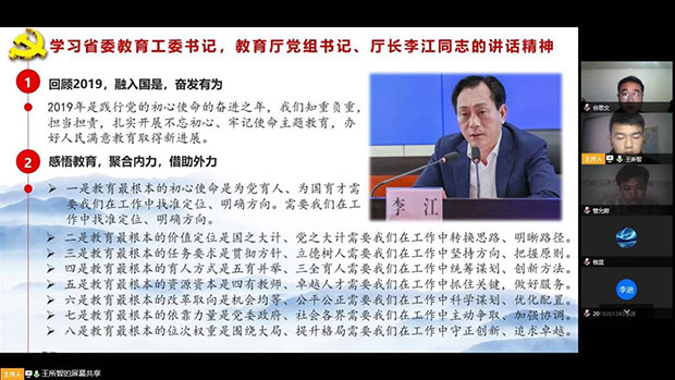 接着大家集中观看了2020年全省教育工作视频会议新闻报道,并学习了李江同志和李光华同志的重要讲话。李江同志对全省教育工作提了四点意见:一是回顾2019,融入国是,奋发有为;二是感悟教育,聚合内力,借助外力;三是鼎兴路上,稳中求进,奋勇争先;四是反观疫情,国运兴衰,匹夫有责。李光华同志对李江同志的讲话做了总结,并就贯彻落实教育工作会议精神提了三点要求:一要认真抓好传达学习。要求各高校通过党委常委会