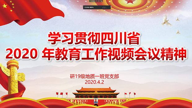 2020年04月02日下午14点整,研2019级地质一班党支部利用腾讯会议平台开展“学习贯彻四川省2020年教育工作视频会议精神”云上组织生活会 。本次活动全体党员同志及入党积极分子均准时参加,无人请假。本次会议由陈梦发同志带领大家学习相关内容。