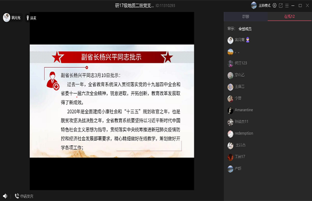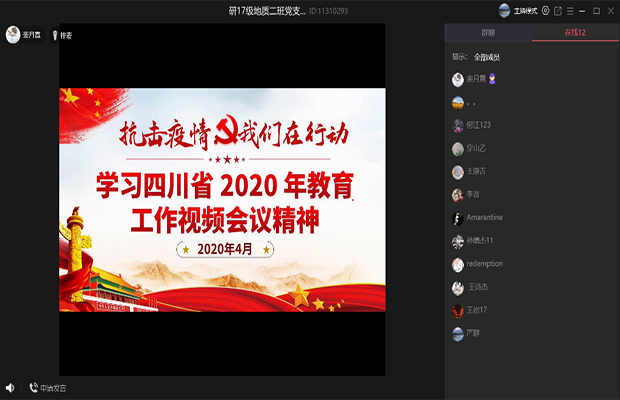 为深入贯彻学习四川省 2020 年教育工作视频会议精神,4月2日晚7点30分,研17级地质二班党支部召开“学习四川省 2020 年教育工作视频会议精神”云上学习研讨会,会议由裴月霓书记主持。