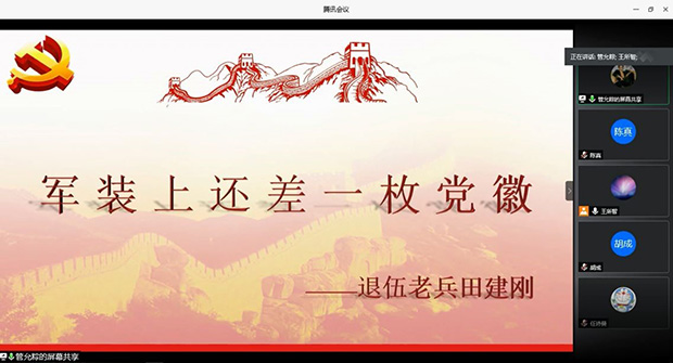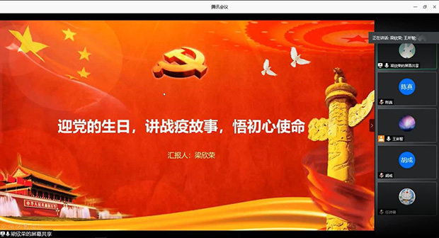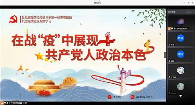研2019级测绘2班党支部开展“四个一”系列活动之专题组织生活会,主题为:迎党的生日,讲抗疫故事,悟初心使命。旨在分享宣传弘扬抗疫一线基层党组织和广大党员干部担当使命、勇毅逆行的先进事迹和精神风貌,鼓舞党员对标先进典型,争做模范党员。此次生活会利用腾讯会议平台开展,活动由党支部书记王所智同志主持,除一名党员和一名积极分子请假,其余同志悉数参会。