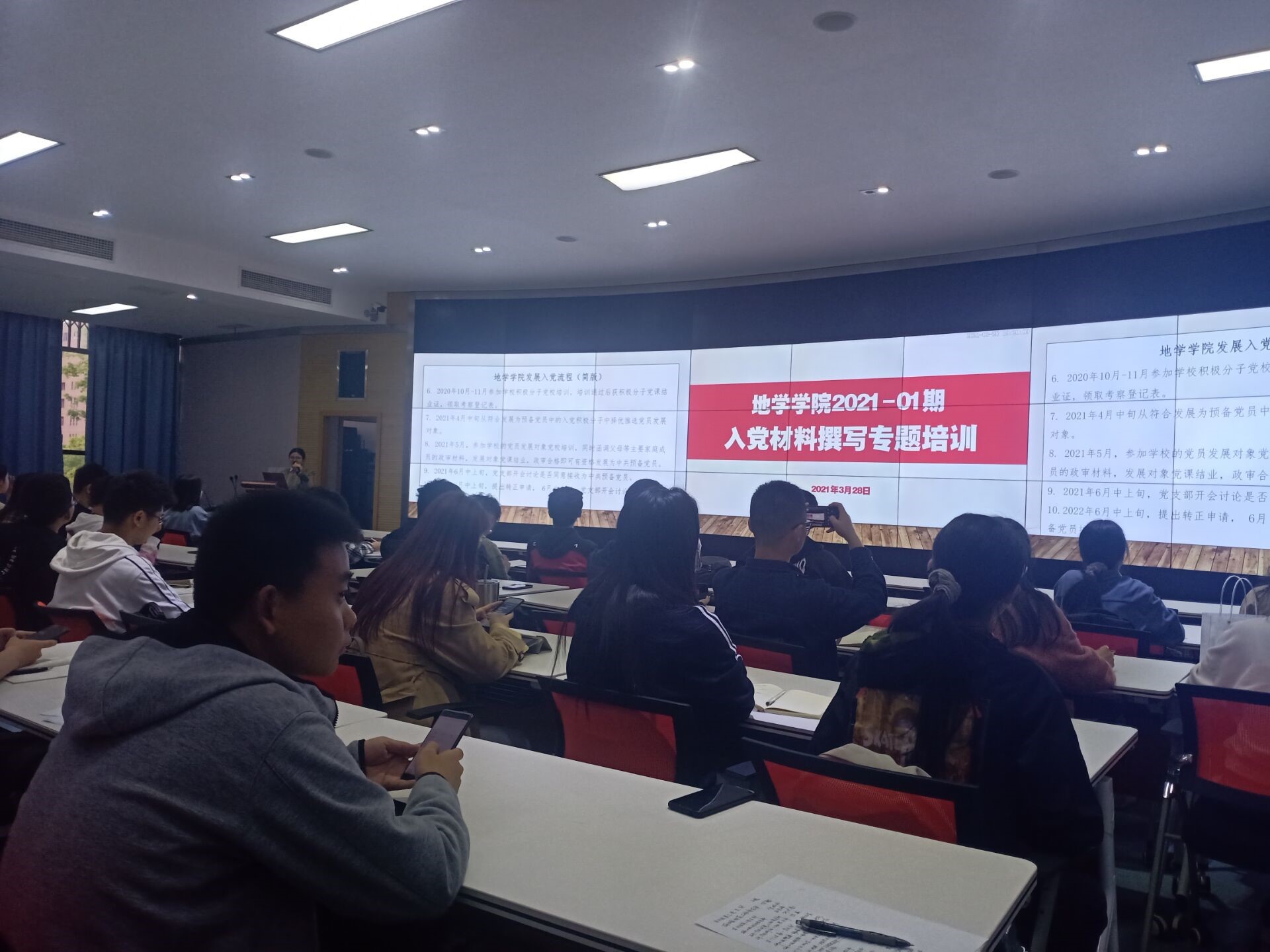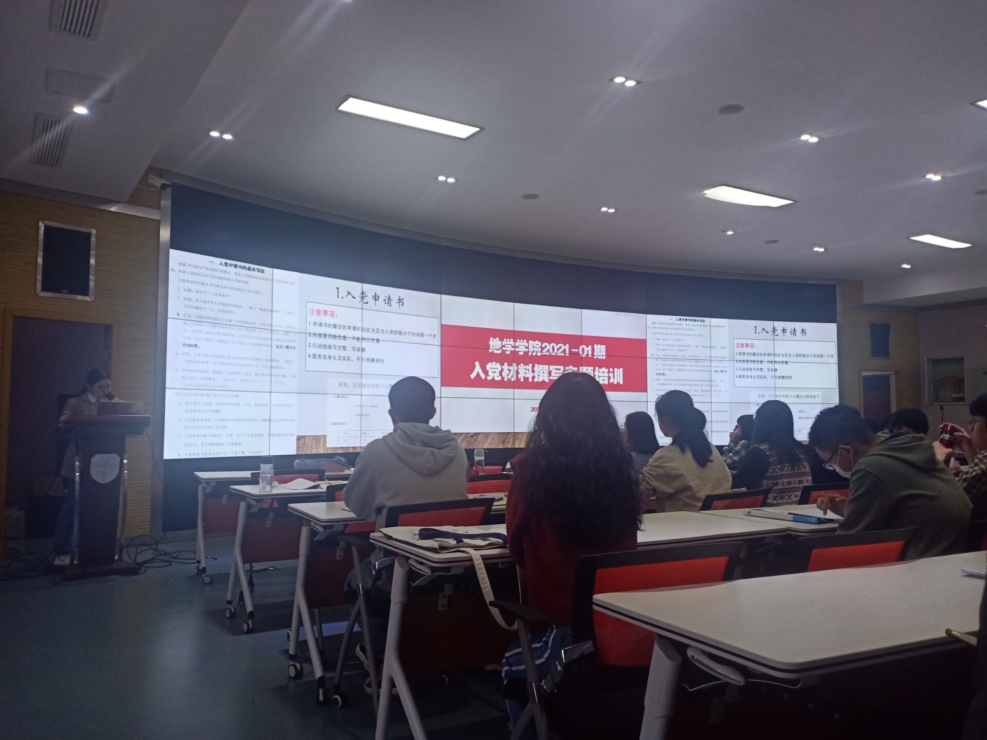接着黄淑怡部长通过多媒体的方式为大家详细介绍了入党的总流程和从申请入党到成为正式的中共党员需要的所有材料以及各阶段材料的具体要求和书写规范。她通过模板举例的方式,真正做到了讲解深入细致,让在座各位发展对象受益匪浅。