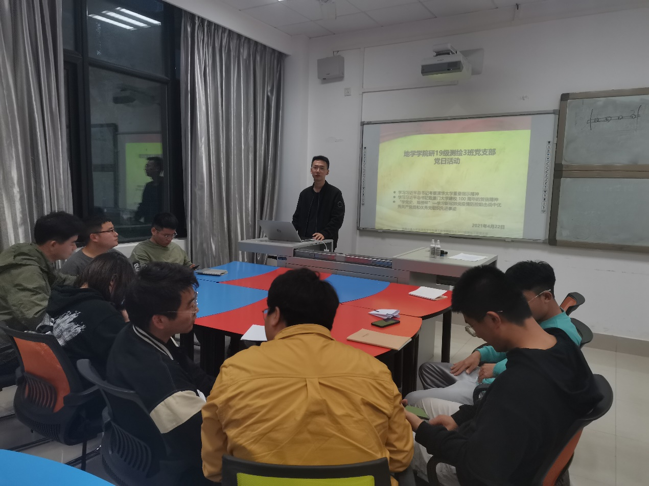 4月22日晚,研究生2019级测绘3班党支部在X4134教室开展主题党日活动。活动内容分为三部分:学习习近平总书记致厦门大学建校 100 周年的贺信精神、学习习近平总书记考察清华大学重要指示精神、观看《榜样5》专题节目学习新冠肺炎疫情防控阻击战中优秀共产党员和优秀党组织先进事迹。活动由支部书记刘明仁主持,支部3名党员参加,6名积极分子参加。