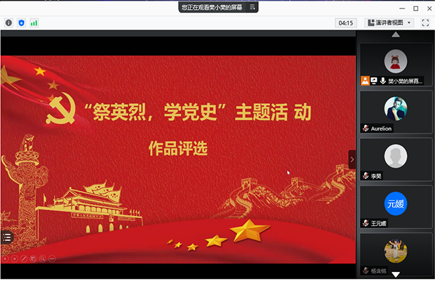 三个党支部的同志积极参与了此次作品征集活动,会议上,同学们通过形式多样的作品来抒发自己对烈士的敬仰之情。有的用手中的画笔勾勒出一幅战士们浴血奋战的慷慨豪情;有的用饱含深情的朗诵来抚慰正义的斗争带来的伤痛;有的用PPT、征文等形式将真情实感展现在字里行间;有的用创意的视频形式来鉴往事,知来者。不管以何种形式,与会的同志们都以敬仰的态度来认真评选每个作品,对伟大的革命烈士们都报以崇高的敬意。