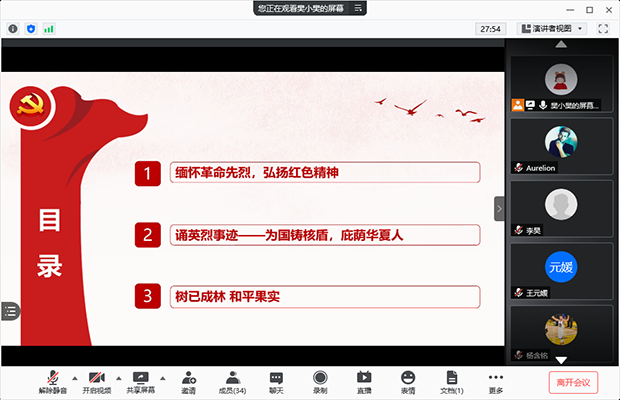 “一个有希望的民族不能没有英雄,一个有前途的国家不能没有先锋”,为表达对革命先烈的缅怀之情,扎实开展党史学习教育,激发广大党员干部知史爱党、知史爱国热情,弘扬坚韧不拔、勇往直前革命精神,2021年4月23日晚上8点,研20级环境联合党支部举行以“缅怀革命先烈,弘扬红色精神”-“祭英烈,学党史”为主题的评选活动,会议由一班支部书记樊佳盼主持。为保证出差在外的所有支部成员都能参与此次评选活动,采用线上会议方式展开。