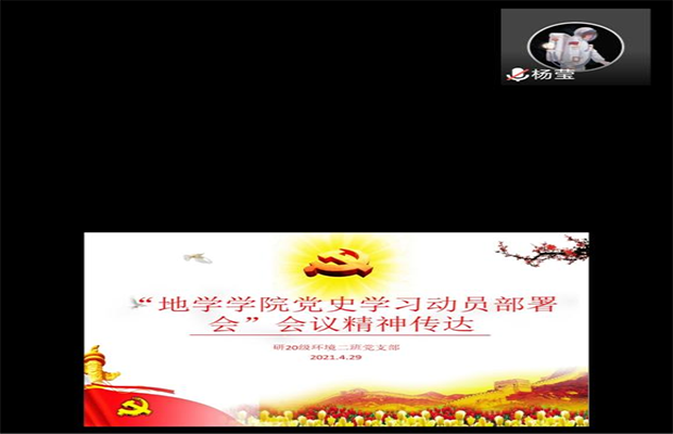 为学懂弄通习近平总书记在党史学习教育动员大会上的重要讲话精神,牢牢把握“学史明理、学史增信、学史崇德、学史力行”目标要求,引导全院上下在“学党史、悟思想、办实事、开新局”中牢记初心使命,发扬奋斗精神,汲取奋进力量,2021年4月29日晚研20级环境二班党支部召开了一次线上主题党日活动。
