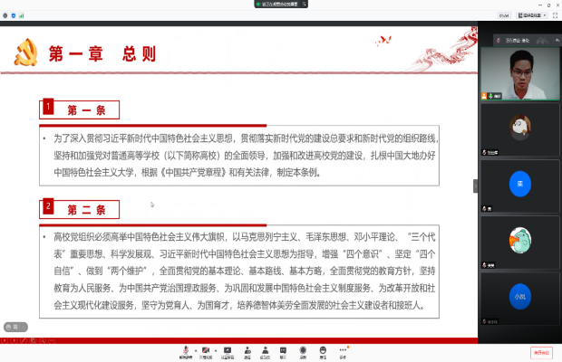 在会议开始前,支部党员和入党积极分子认真阅读并自学了《条例》。会议过程中,蒲伦通过PPT带领大家又重点学习了《条例》中的总则、组织设置、主要职责、党的纪律检查工作、党员队伍建设、思想政治工作等和当前党支部紧密相关的内容,并表示作为学生党员务必要深入领会《条例》精神,全面掌握《条例》内容,严格遵守和执行《条例》规定。