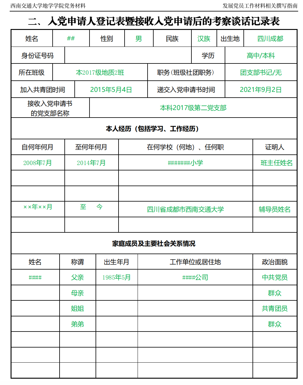 入党申请人登记表暨接收入党申请后的考察谈话记录表撰写指南: