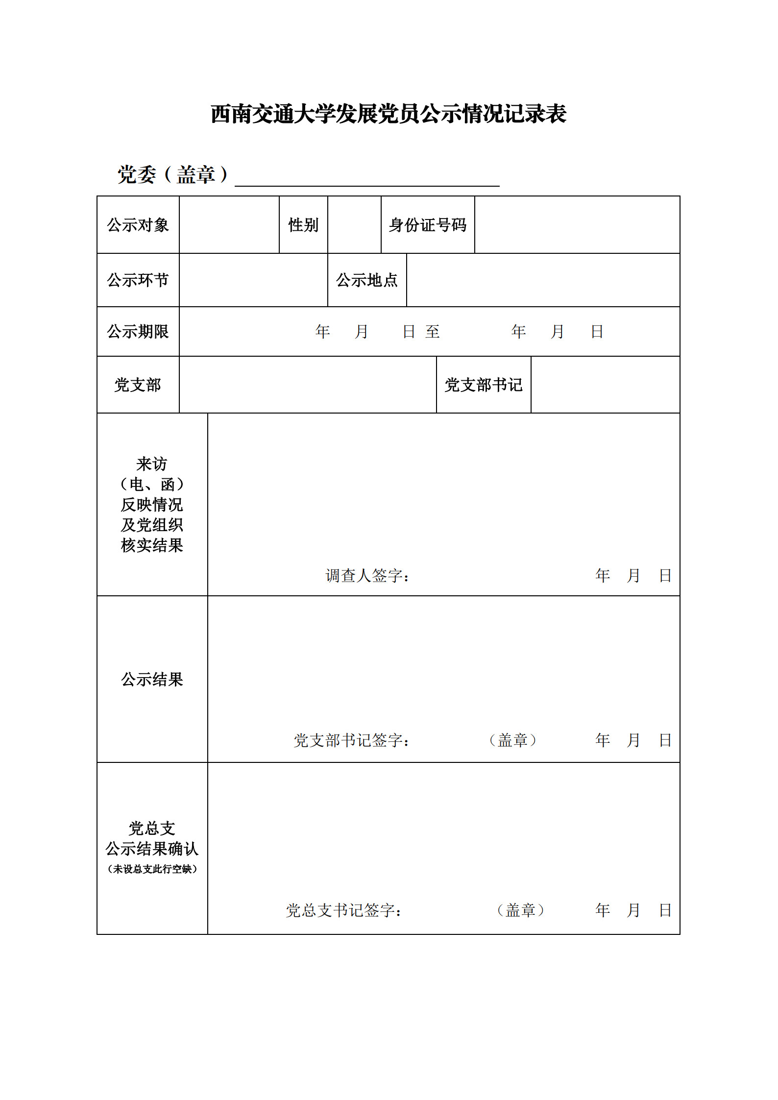 西南交通大学发展党员公示情况记录表样例: