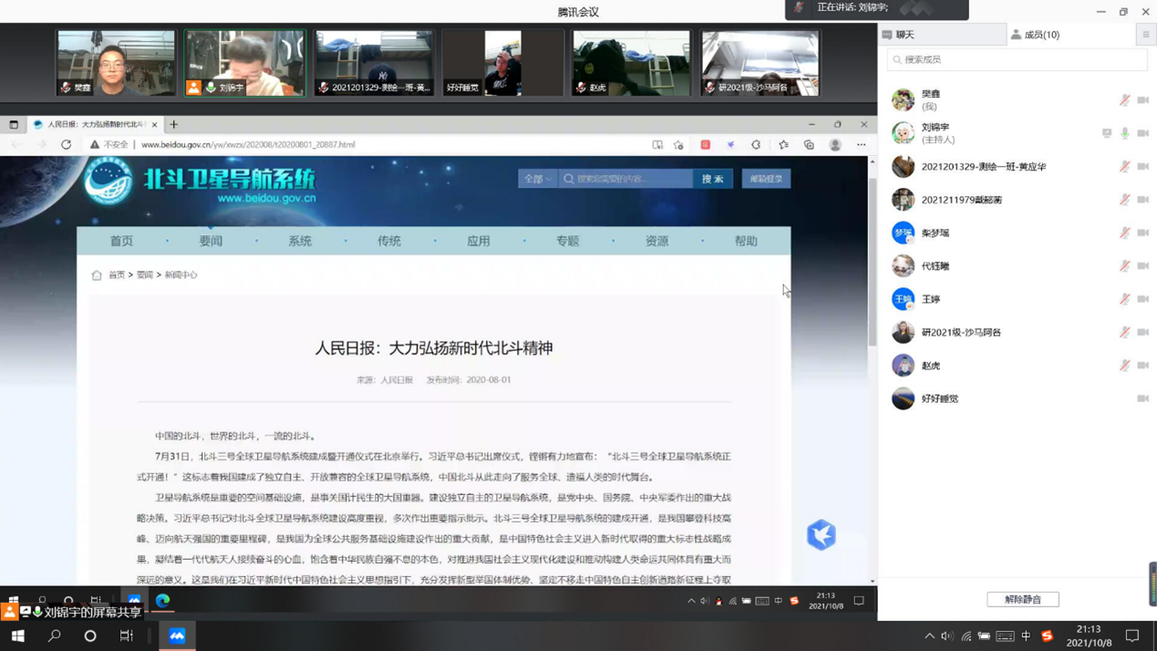 队长刘锦宇表示:通过学习党史与习近平总书记“七一”重要讲话精神,他深刻的理解到深入学习宣传贯彻习近平总书记“七一”重要讲话精神,是当前和今后一个时期一项重大政治任务,是党史学习教育核心内容,需要持续推进、不断深化。北斗导航定位研究团队应切实把思想行动统一到讲话精神上来,同心同德、斗志昂扬奋进新征程、建功新时代!向测绘行业为国奉献的老前辈学习,不怕牺牲,不惧挑战,继往开来为国家的发展做出测绘人的贡献。