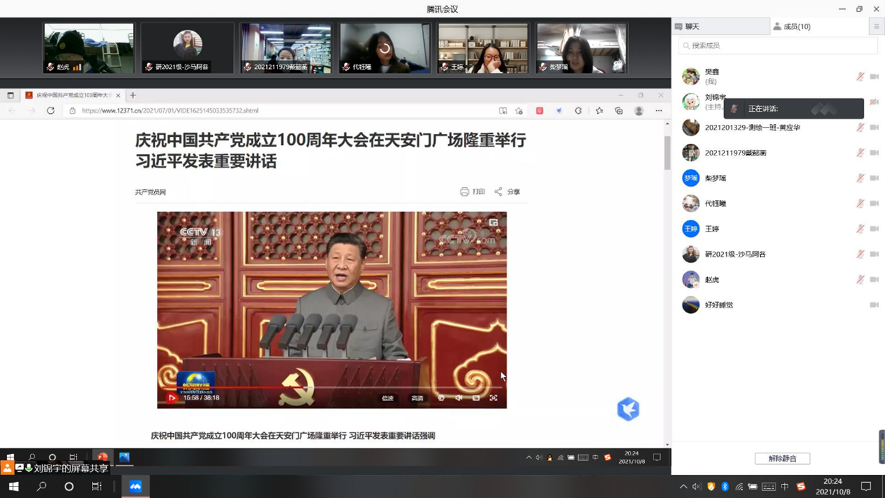 首先,队长刘锦宇同学带领大家集体学习了党的百年峥嵘历史。习近平总书记指出:“中国有了中国共产党执政,是中国、中国人民、中华民族的一大幸事。”没有中国共产党就没有新中国,就没有中国特色社会主义,就没有中华民族伟大复兴。中国共产党成功的密码是什么?为什么只有中国共产党才能领导人民创造人间奇迹?在中国共产党百年华诞之时,深刻感悟中国共产党为什么“能”的内在逻辑,对于在新的历史起点上开启第二个百年奋斗目标和坚定道路自信,具有十分重要的意义。刘锦宇同学通过引用习近平总书记的讲话,向团队同学阐述了党史学习的重大意义。