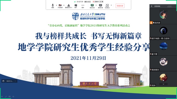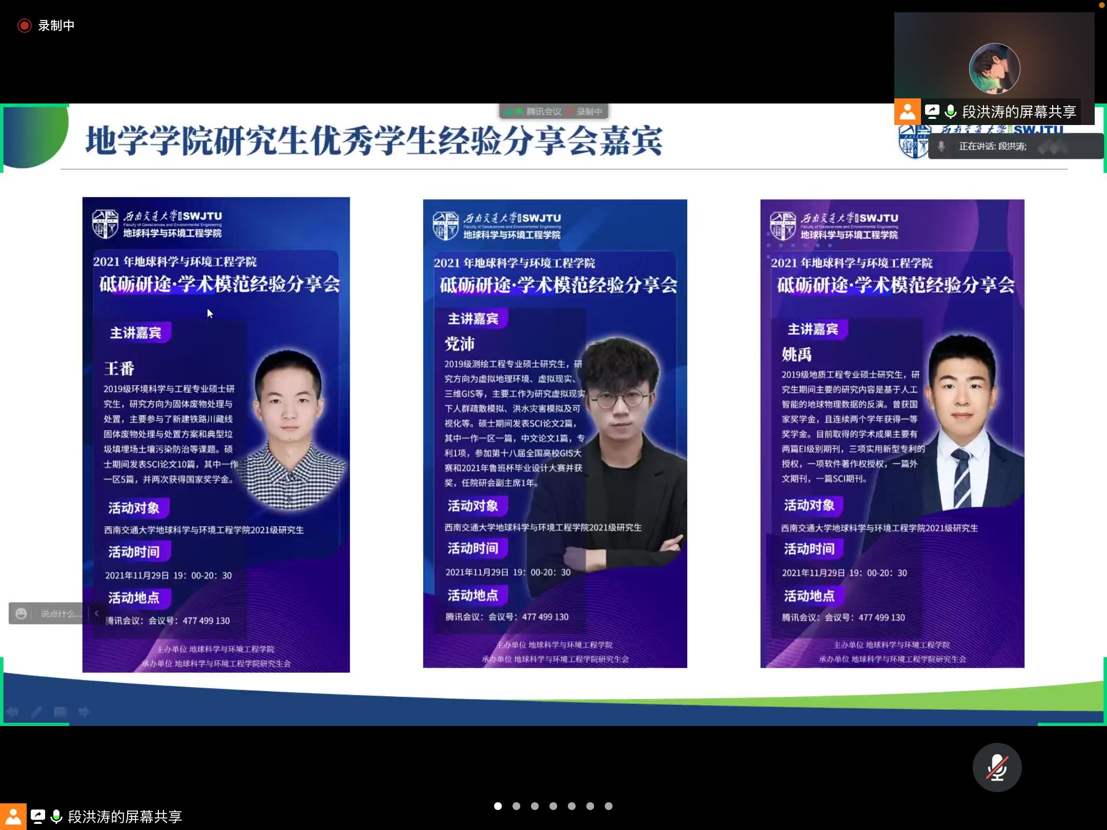 于2021年11月29日19:00-20:30采用线上腾讯会议方式举办了砥砺研途·优秀学生经验分享会,本次经验分享会特意邀请了三位国家奖学金得主:王番(2019级环境科学与工程专业硕士研究生)、党沛(2019级测绘工程专业硕士研究生)、姚禹(2019级地质工程专业硕士研究生),来为同学们分享他们在学术过程中的心得体会。