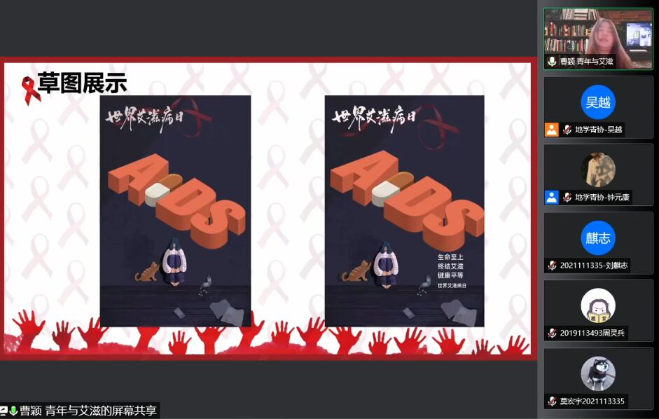 决赛于12月12日线上举行,答辩前,地学青协指导老师罗然老师对本次大赛进行精彩致辞。在答辩过程中,各位参赛选手用精彩的发言为我们展现了其作品的创作思路、制作过程等,呼吁大家做到“生命至上,终结艾滋,健康平等”。答辩结束后,学生园区自我管理委员会指导老师刘颖老师对本次比赛进行了精彩深刻的总结。决赛最后,由工作人员统计评委们公正客观的评分,评选出优秀作品共11项。