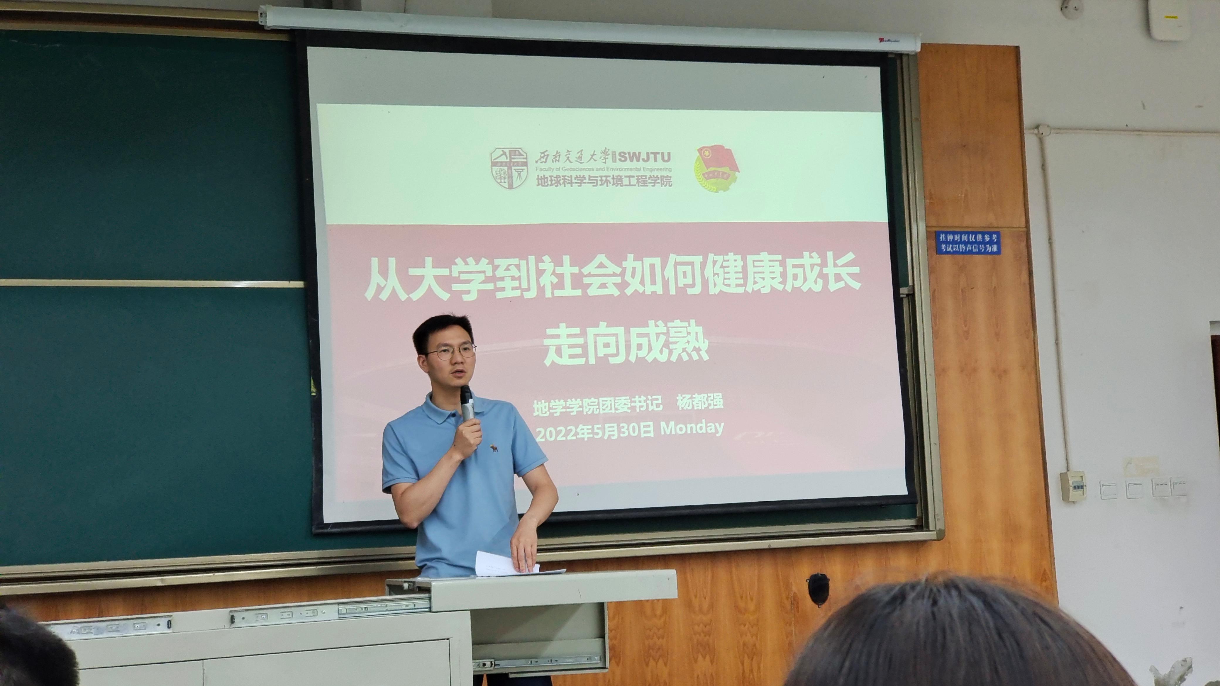 团委书记杨都强主讲的“从大学到社会如何健康成长走向成熟”讲座在我校犀浦校区X4151成功举行,讲座主要围绕大学生步入社会后的思想和心理建设展开,参会人员从中获得了不少宝贵的经验。